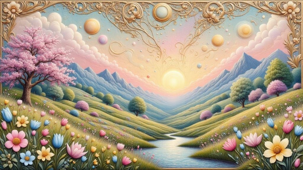 This image depicts a serene spring landscape with a gentle stream, vibrant flowers, and a celestial showcase of stars, moon, and sun, all blended in soft, feathery brushstrokes, in a delicate pastel palette with embossed details, reminiscent of a J.M.W. Turner painting.