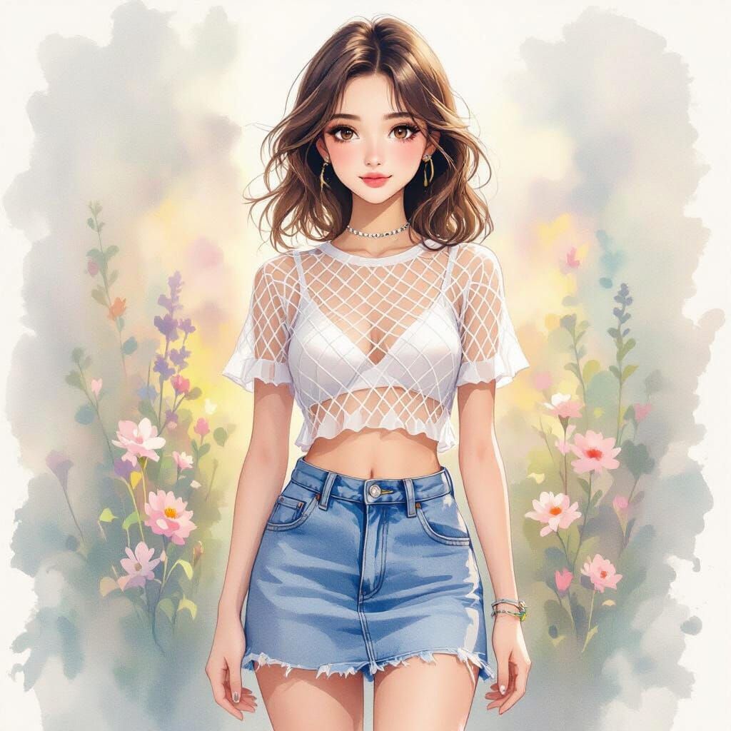 This image shows a confident teen girl in a denim skirt and fishnet top. Rendered in a dreamlike watercolor style with soft, pastel colors and atmospheric lighting.