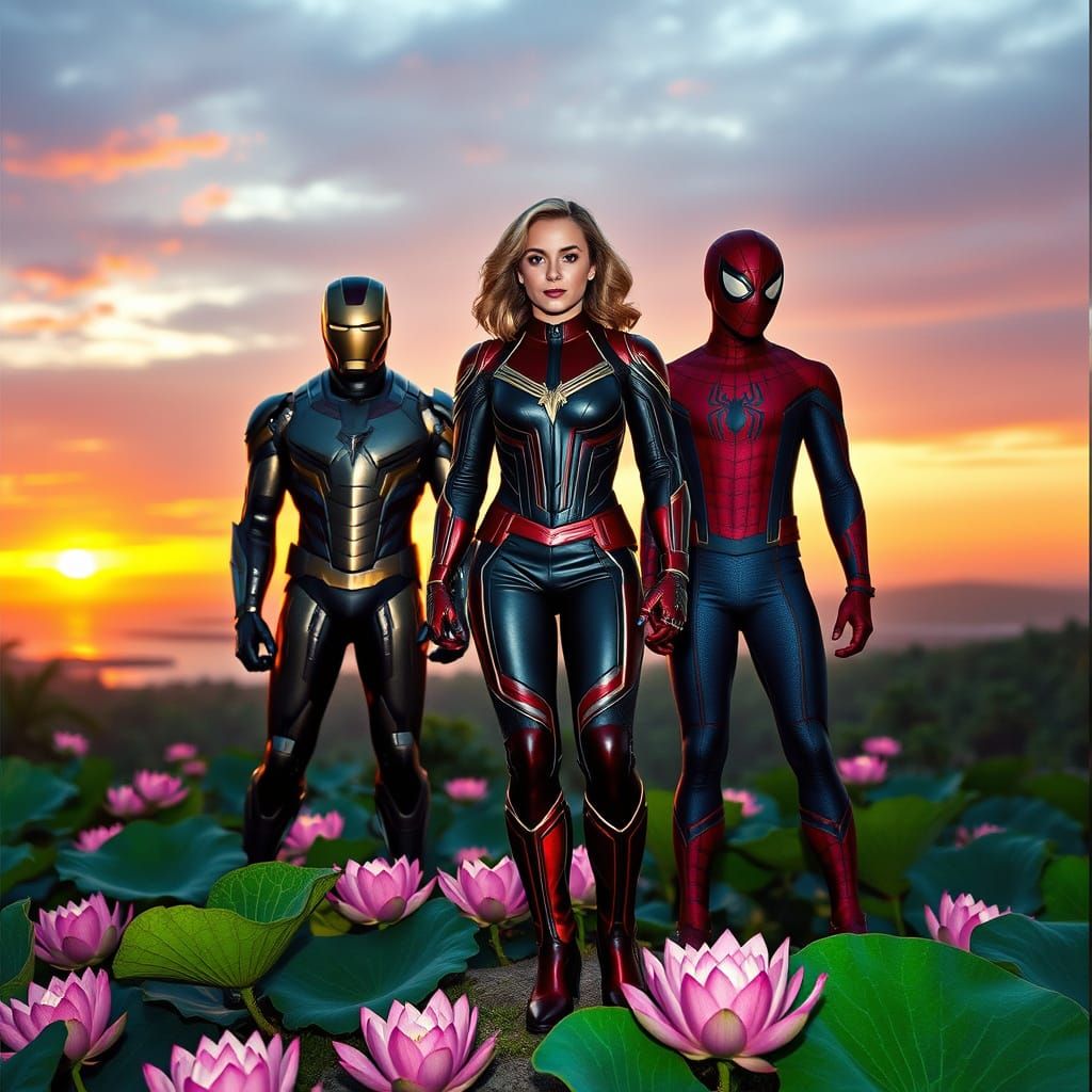 A cinematic still of Captain Marvel, Iron Man, and Spider-Man on Emerald Hill at sunset. The superhero trio is surrounded by lotus flowers in this filmic image.