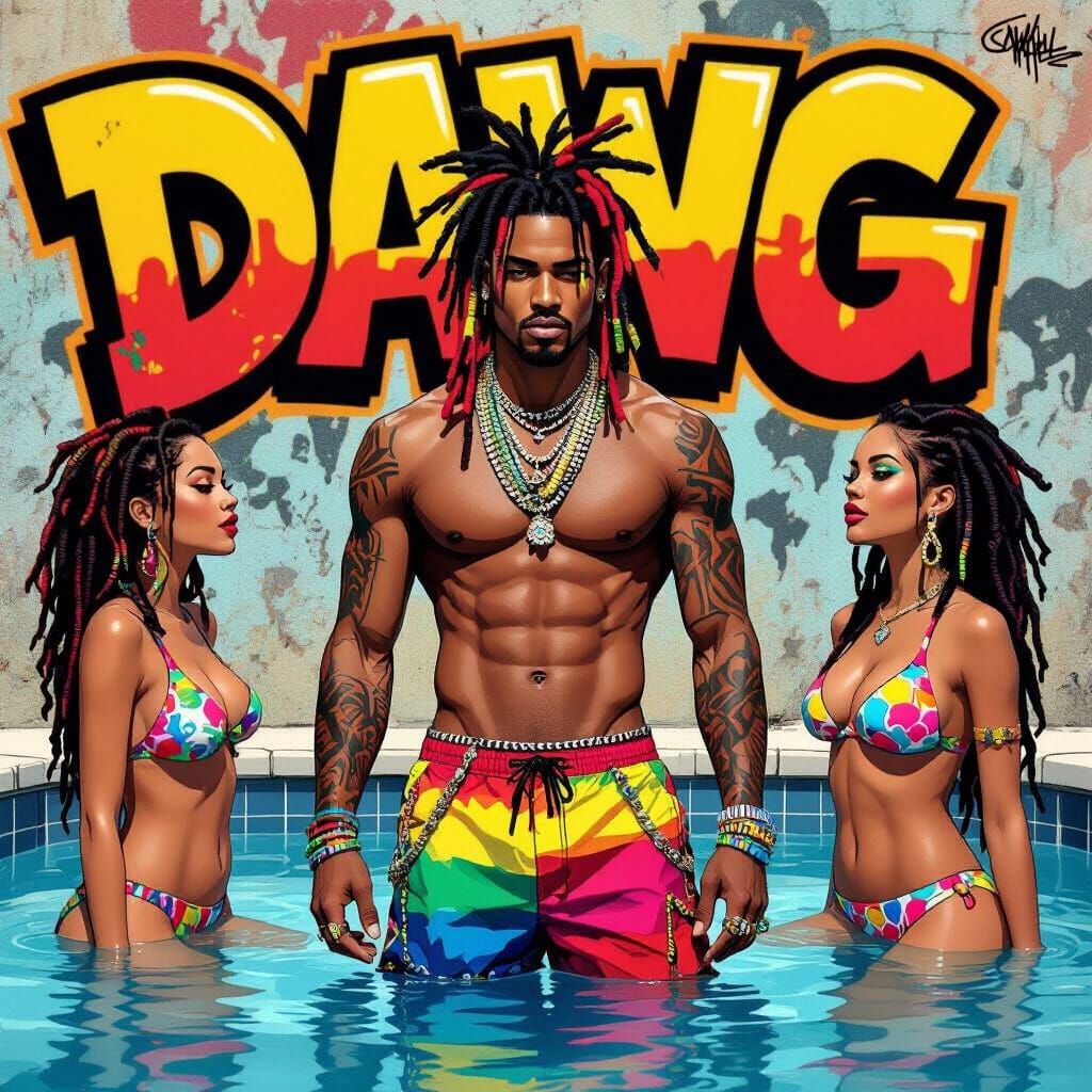 A skinny man with dreadlocks stands in a pool, adorned with chains and colorful shorts. He is flanked by two women in bikinis. The scene features bold graffiti and a vibrant comic book aesthetic.