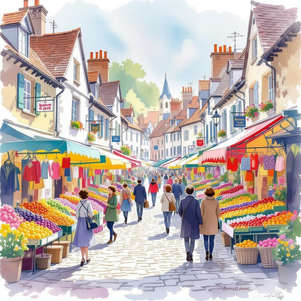 A vibrant market scene with shoppers and colorful stalls. This watercolor image captures a whimsical, elegant style with loose brushstrokes and soft textures, reminiscent of art nouveau.