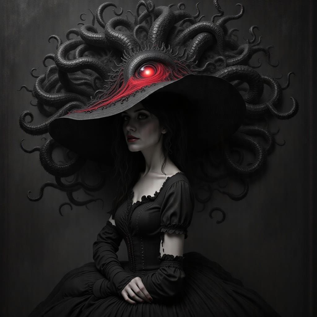 A stark black-and-white portrait reveals a woman poised in eerie stillness, her elegance masking something unspeakable. Upon her head rests not a hat, but an otherworldly construct of living shadow — a crown of writhing forms and abstract dread. Its edges blur into tendrils of smoke and bone, whispering shapes that seem to twist between dimensions. A single crimson streak cuts across her face, the only defiance of color in an ocean of monochrome. Behind her, darkness churns like a sentient void, evoking the vast horror of the unknown. The image fuses the haunting surrealism of Zdzisław Beksiński with the biomechanical terror of H.R. Giger, rendered in dramatic chiaroscuro that transforms fear itself into high fashion — horror worn like couture.
