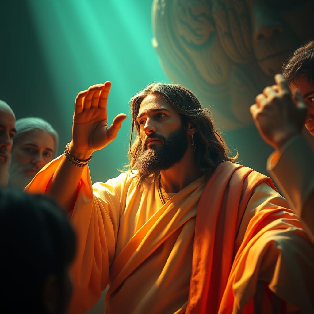 This image depicts Jesus in a biblical scene, characterized by dynamic lighting and intricate details. It features triadic colors and volumetric lighting, rendered as digital art.