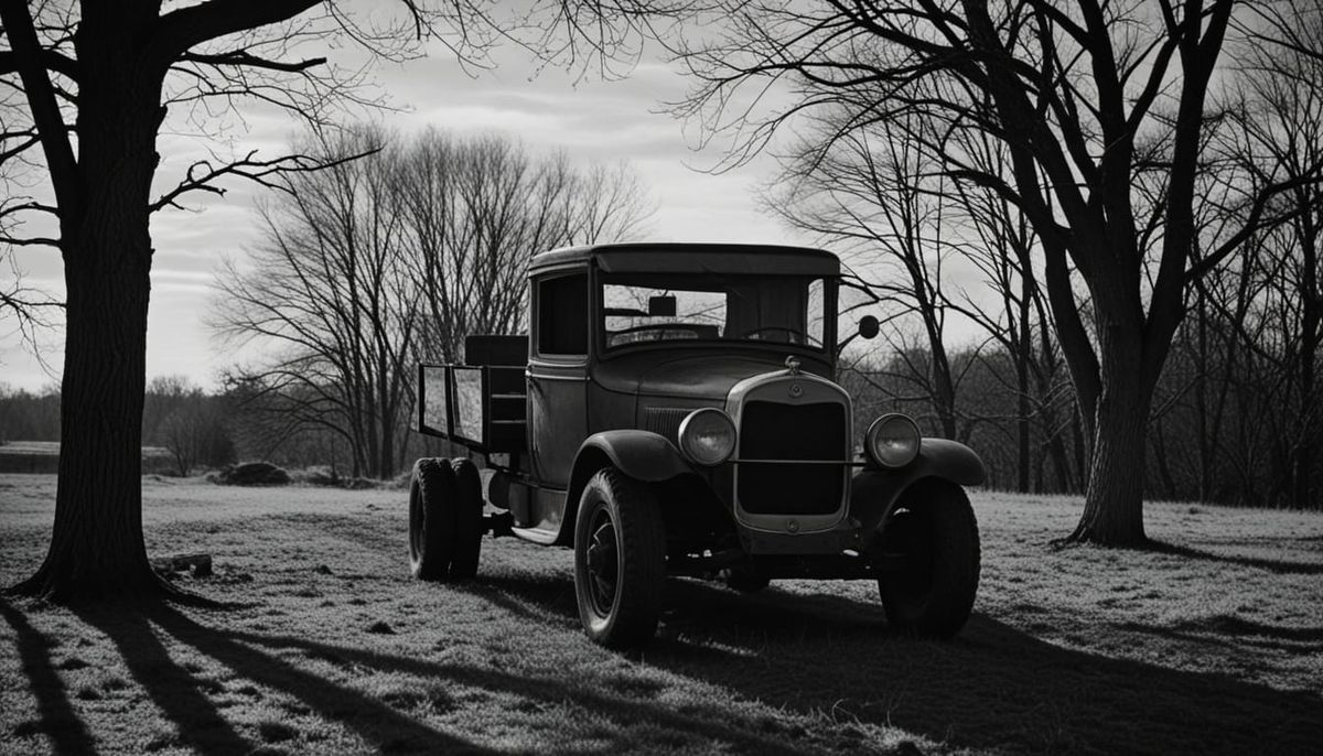 This atmospheric black and white film still captures a worn rural landscape in Kent County, Delaware. Shot in a cinematic style with dramatic shadows and vintage farm equipment in the distance, the image exudes a sense of nostalgia and timelessness.