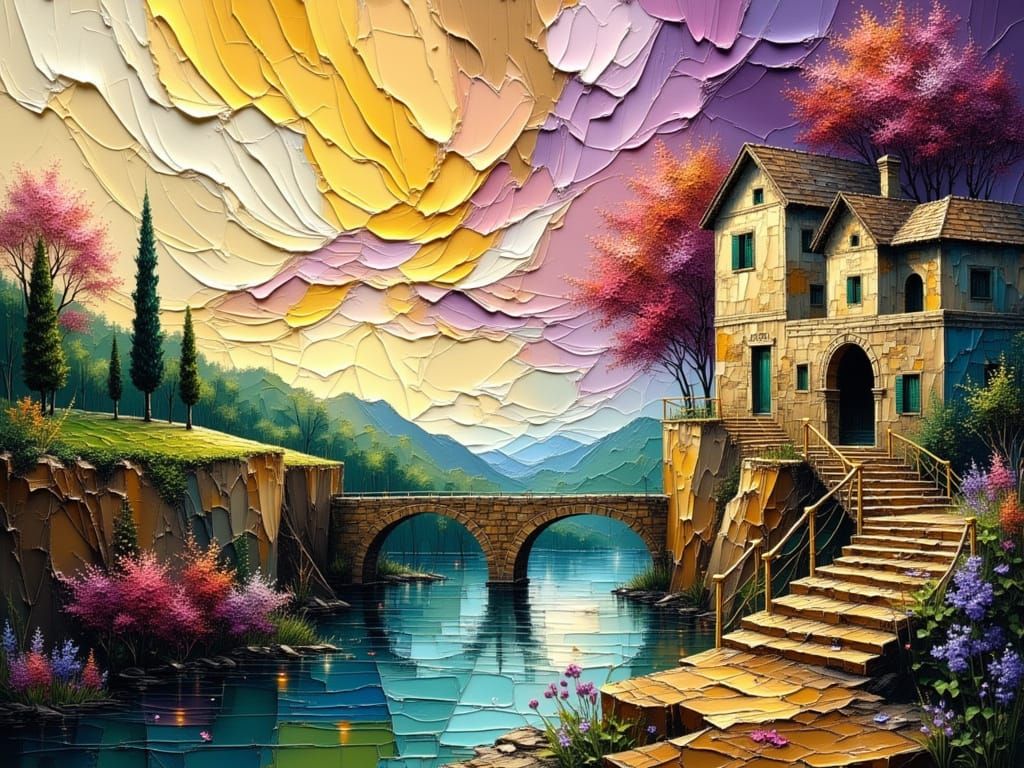 A stunning Impressionist painting of a rustic Italian villa on a cliff, with a bridge over a river. Features thick impasto brushstrokes and a vibrant, multicolored sky.