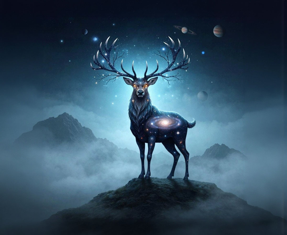 This image shows a stag with constellation-like antlers on a misty mountain, its eyes glowing. The fur displays stars and galaxies, illuminated by distant stars, in the style of fantasy concept art.
