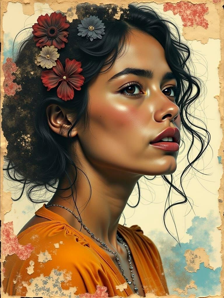 This image presents a detailed mixed media collage featuring a young woman. It incorporates torn paper, fabric, and lace elements with deep colors and intricate 2D artistry.