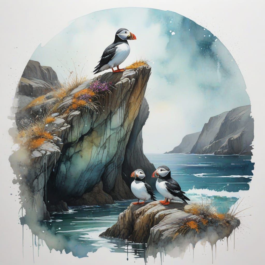 This dreamlike image captures a serene sea cave bathed in lunar light, with tidal patterns etched on rugged cliffs and a vibrant puffin perched on a rocky outcropping, blending watercolour and cinematic styles.