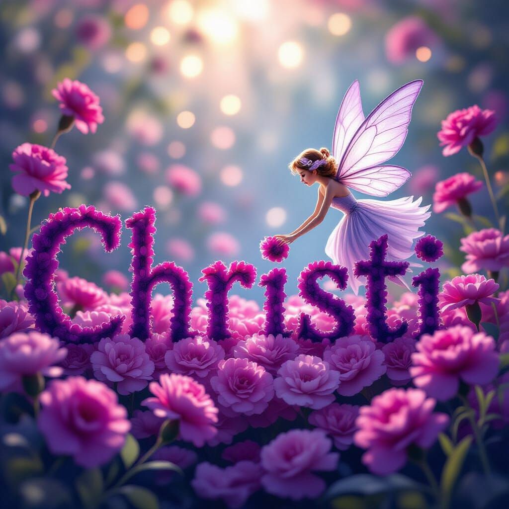 This image showcases the name Christi crafted from vivid purple carnations, accompanied by a delicate fairy. Soft, magical lighting creates an ethereal glow in a dreamy garden setting, rendered in a detailed fantasy illustration style.