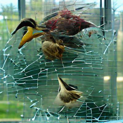 This image shows a flock of birds unable to pass through a glass barrier. The scene evokes themes of fragility, futility, and the impact of unseen obstacles in a minimalist style.