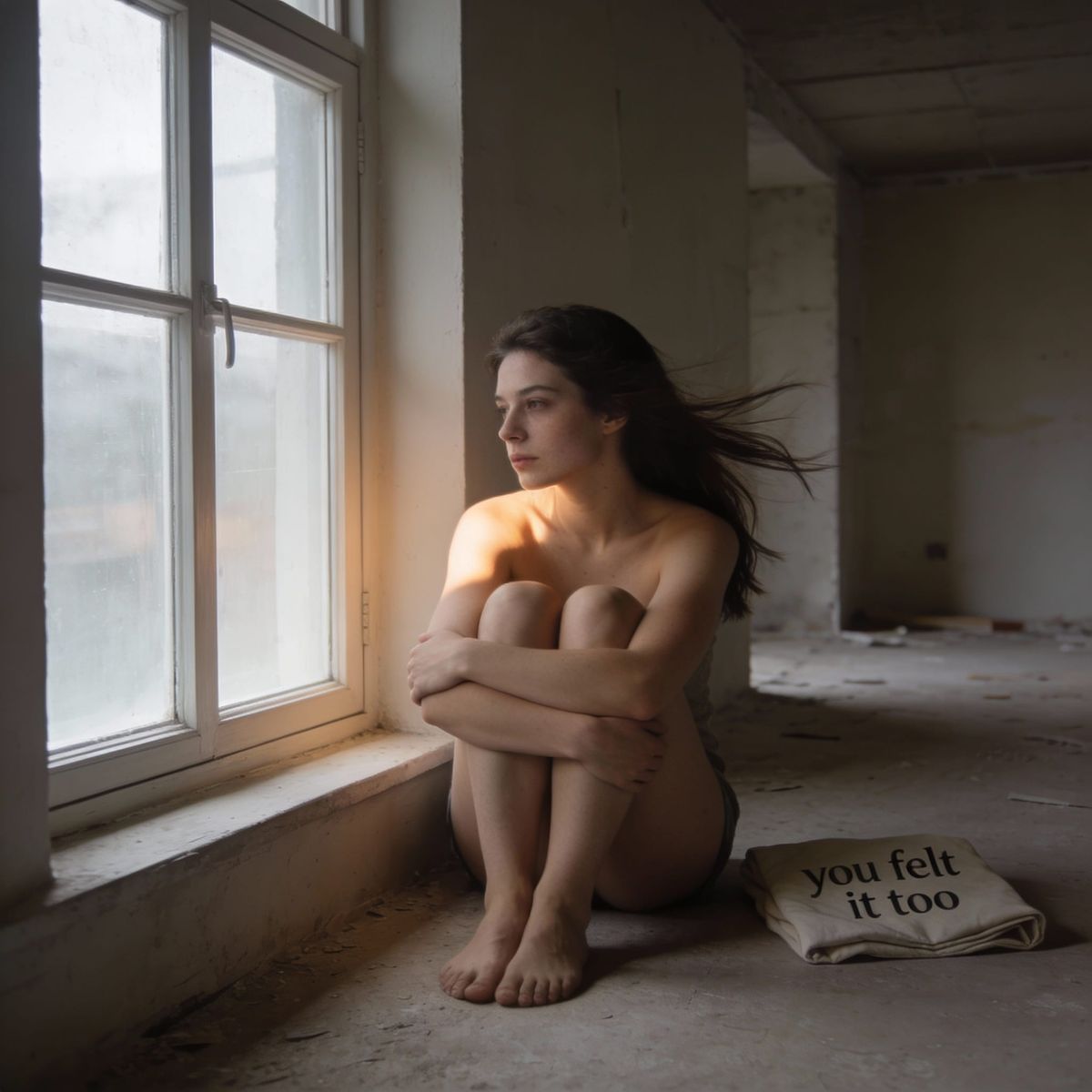 This image captures a woman in a moment of quiet solitude, sitting by a window. The soft, natural light highlights her presence, creating an atmosphere of introspection and unspoken emotion.