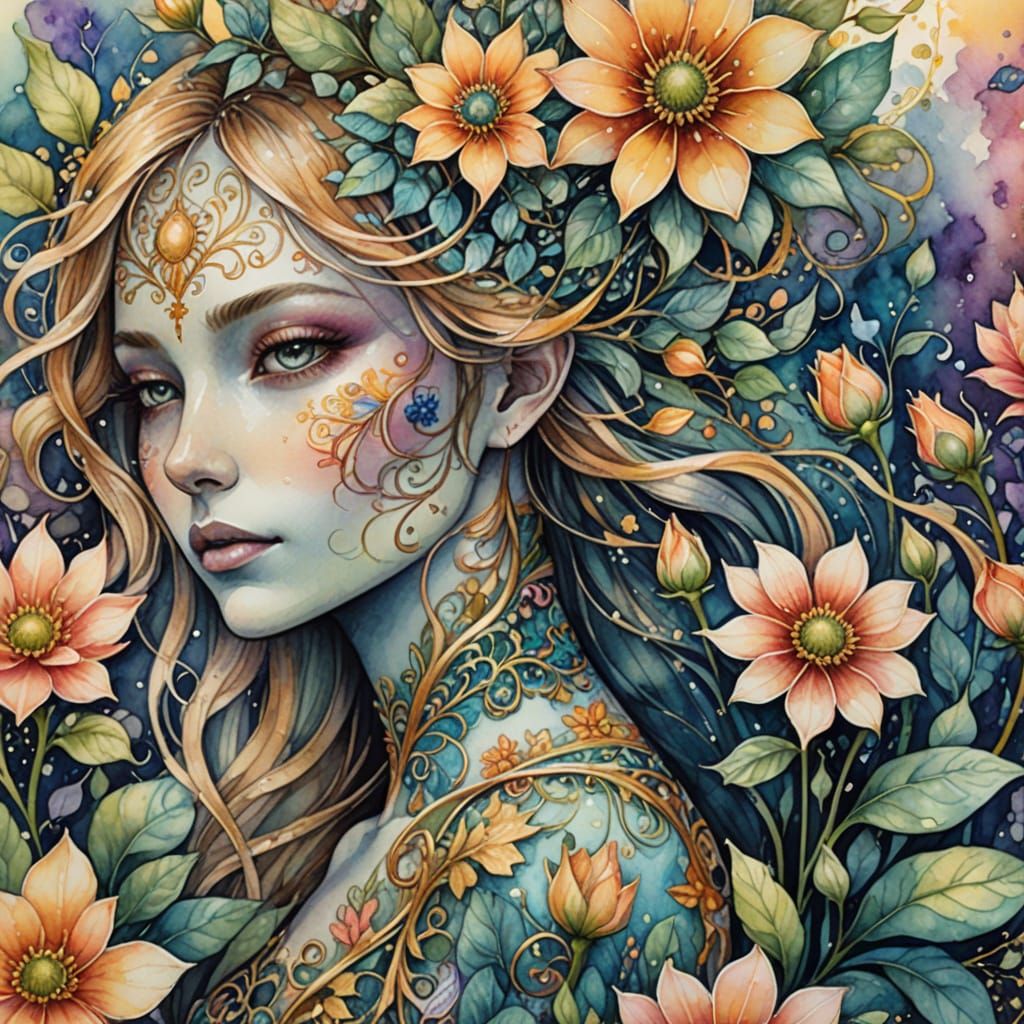 This image depicts a stunning magical humanoid flower in a lush garden setting, characterized by delicate petals, soft features, and vibrant colors. The artwork features intricate patterns, warm golden light, and a dreamy atmosphere.