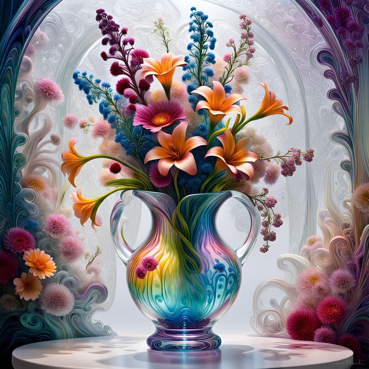 A vibrant digital painting of a transparent glass vase filled with quantum flowers. The surreal composition features iridescent textures, volumetric light, and vivid colors that create a dreamy, ethereal effect.