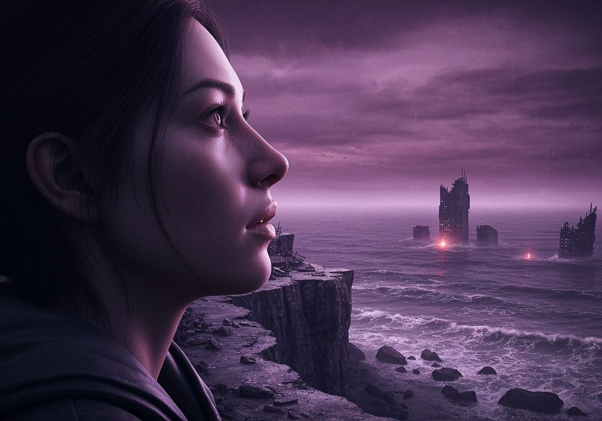 This hyperrealistic image shows a woman on a desolate cliff, gazing at a stormy sea under a bruised purple sky. Evokes profound isolation and decay.