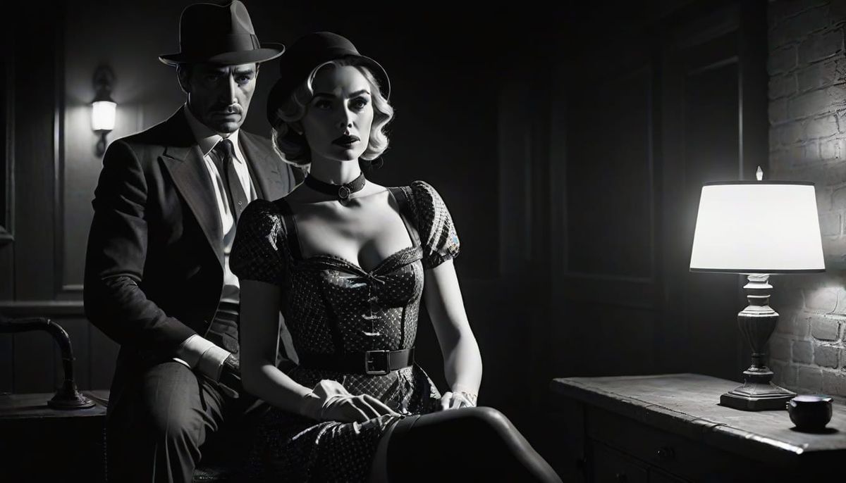 A striking black-and-white image of a woman in a glamorous dress, sitting on a wooden chest, gazing intensely at a mysterious figure in the shadows, evoking a sense of suspense and dramatic tension in a high-contrast cinematic still.