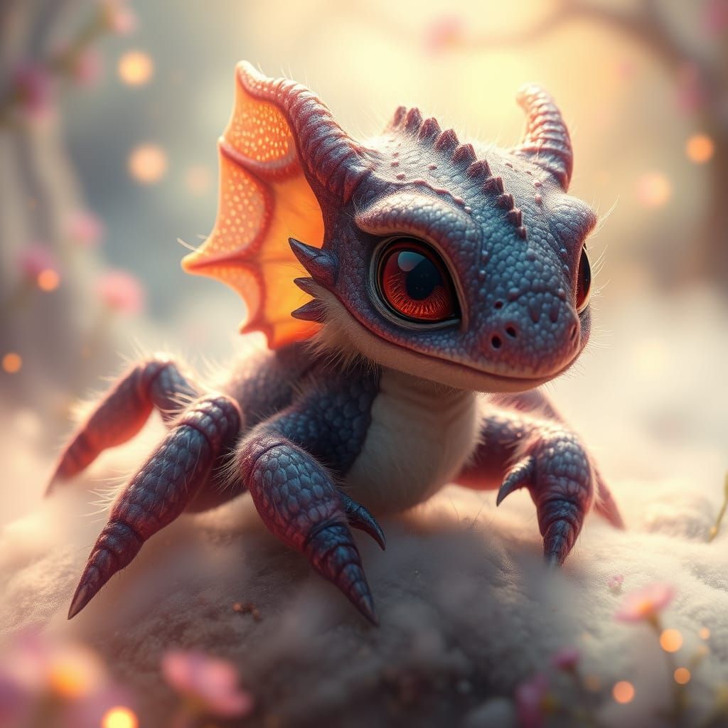 A charming image of a baby spider-dragon hybrid frolicking in a magical fantasy world. The scene features soft textures, hyperdetailed mist, and warm light, in a dreamy, serene aesthetic.