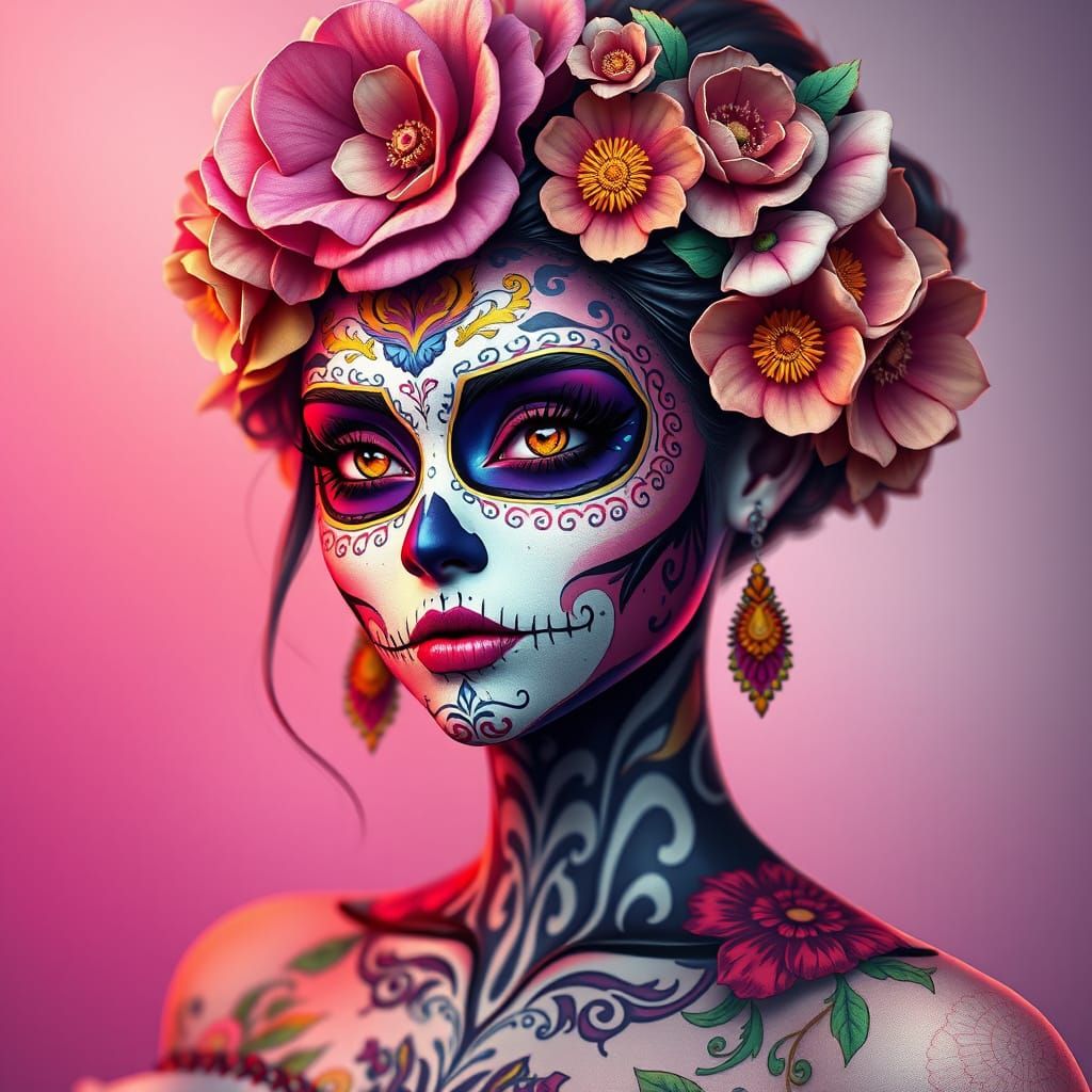 A stunning 3D anime portrait of a woman wearing vibrant Día de los Muertos face paint, adorned with intricate sugar skull designs, colorful flowers, and ornate patterns, in a highly detailed anime style with breathtaking realism.