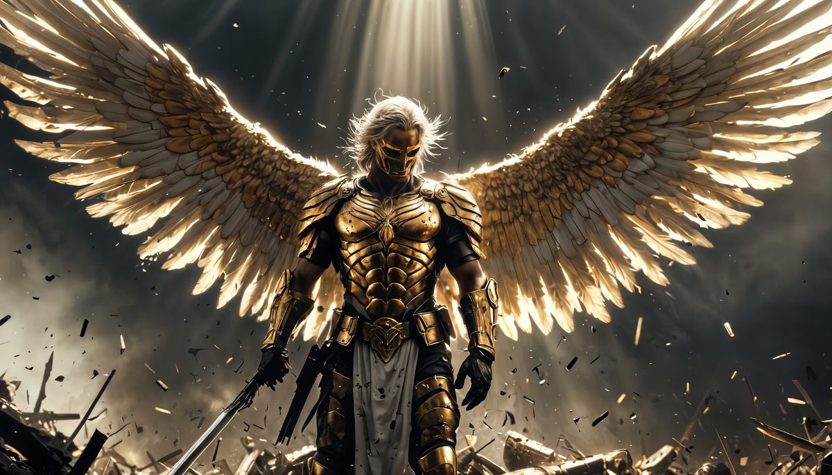 A dramatic image of an angel descending onto a battlefield. The angel wears golden armor and torn wings, with bright light shining down in a gritty, cinematic style reminiscent of war films.