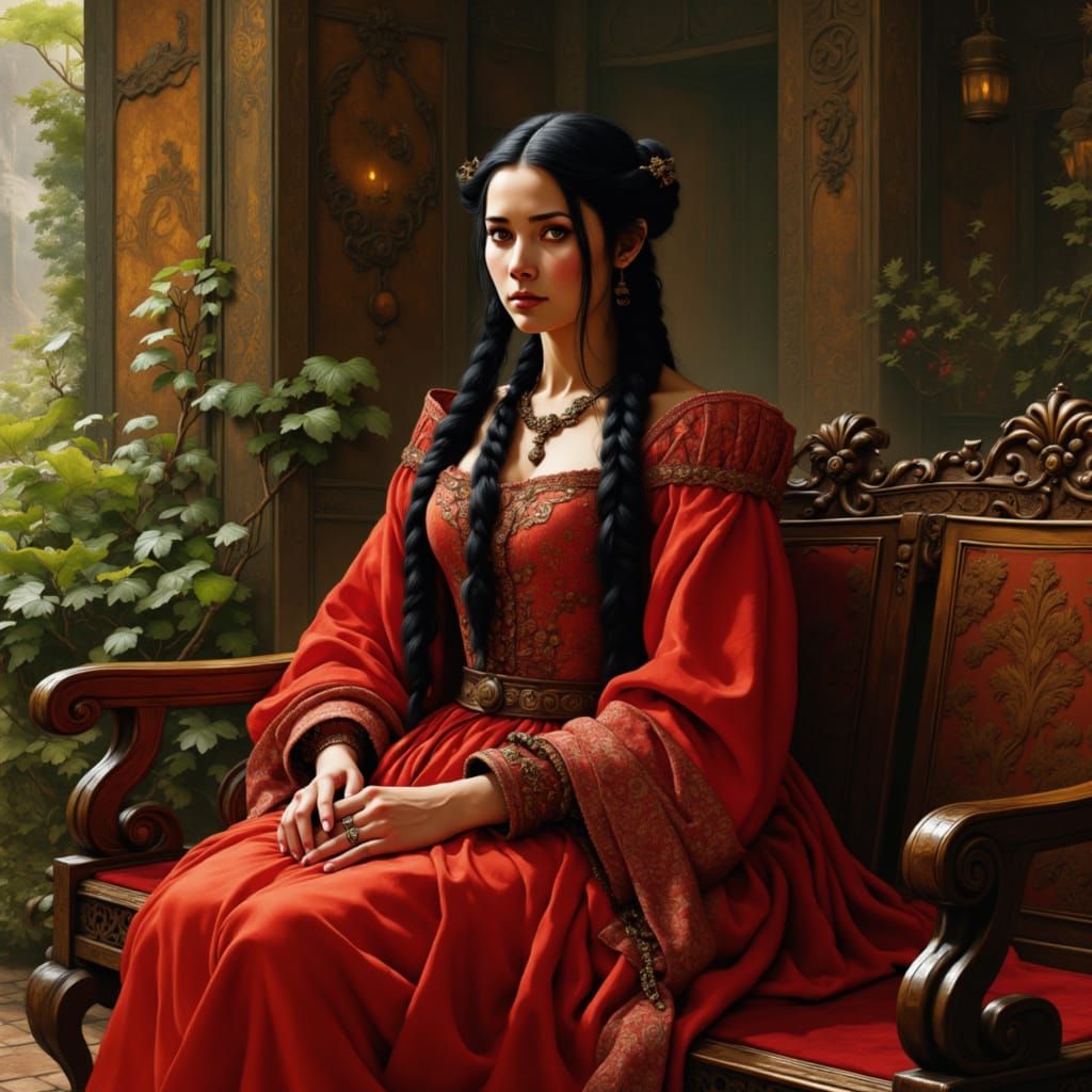 Photorealistic portrait of a full-figured young woman with long black braids, wearing a red sarafan. She sits on a wooden bench in a lush Russian garden, illuminated by warm, volumetric light, evoking 17th-century portraiture.