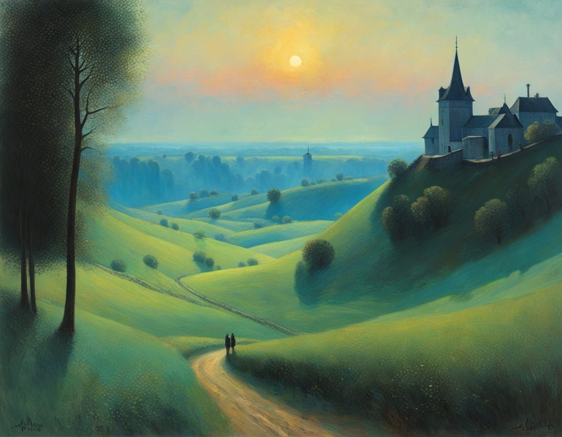 This image brings together the Impressionist and Surrealist styles in a unique landscape painting, blending the dreamlike quality of the latter with the soft, natural light of the former.