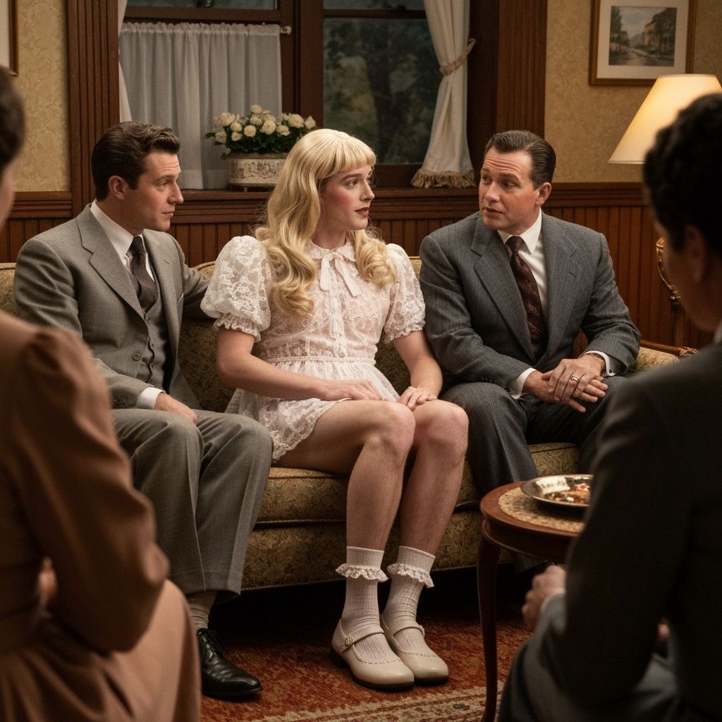 This image depicts a 1950s living room scene featuring a young person crossdressing in a short lace dress, wig, and Mary Jane shoes, interacting with family on a couch.