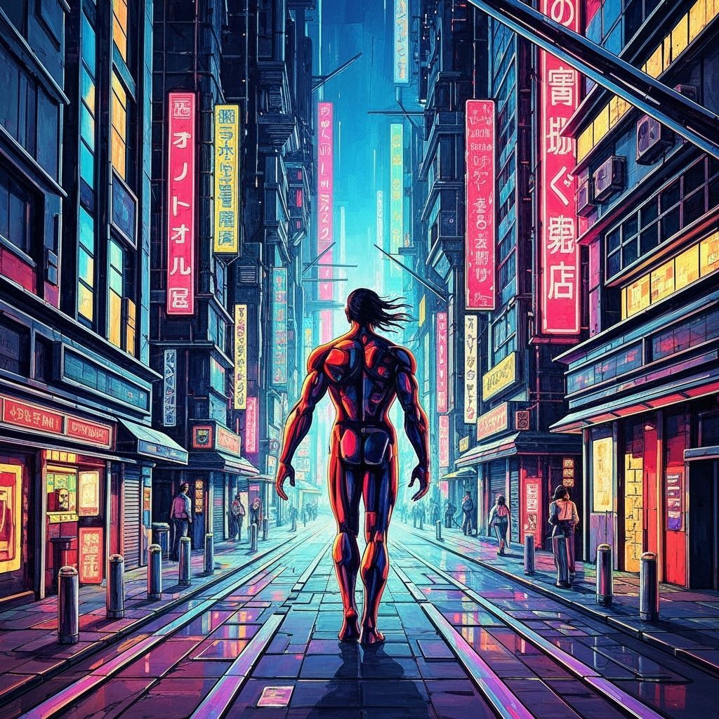 A vibrant cubist masterpiece, blending the iconic styles of Pablo Picasso and Katsuhiro Otomo's Akira. Gleaming chrome and neon signs illuminate a futuristic cityscape, rendered with sharp, geometric fragmentation. A solitary figure, inspired by Tetsuo Shima, stands amidst the chaos, their form deconstructed ...
