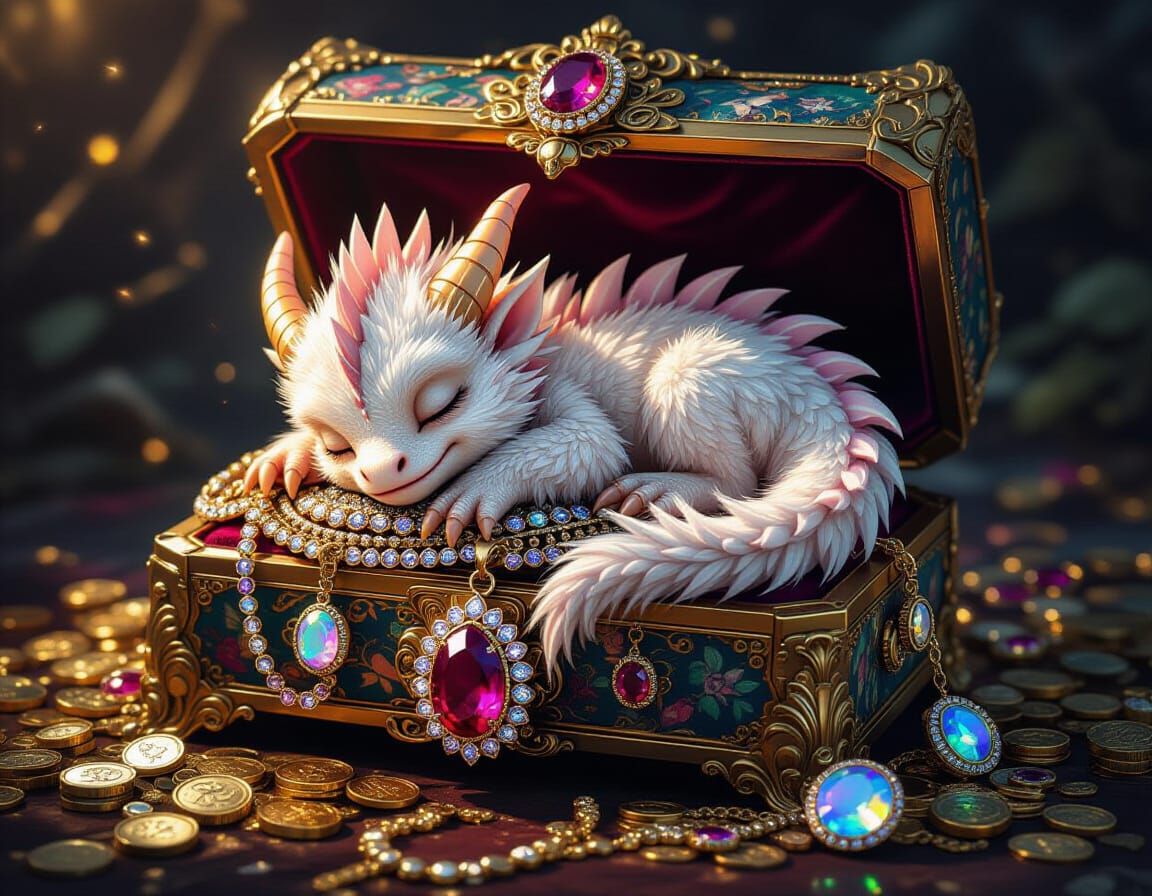 This image shows a cute, fluffy baby dragon asleep on a ruby necklace inside a treasure chest. The digital artwork features overflowing jewelry, gold coins, and dramatic lighting.