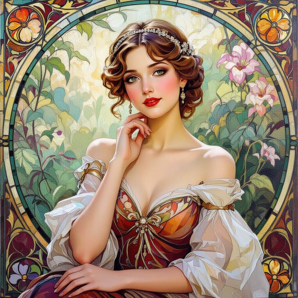 A striking picture of a beautiful young lady in elegant attire, posing in a lush environment. The artwork is reminiscent of Art Nouveau and impressionist oil paintings.