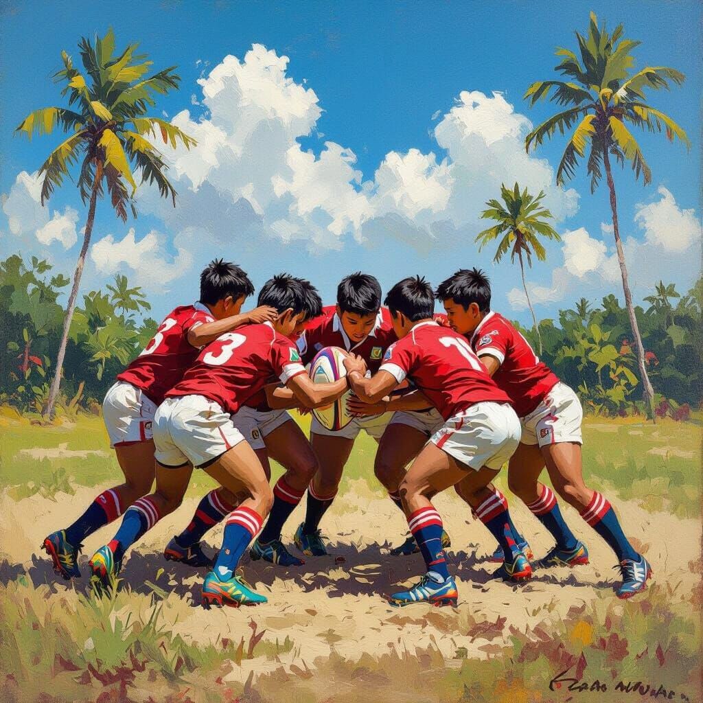 This image shows Indonesian boys in a rugby scrum on a field with coconut trees under a blue sky. The scene is rendered with vibrant colors and expressive brushstrokes, in an impressionistic style.