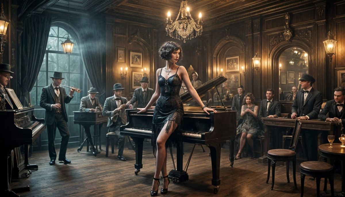 A captivating image of a gothic marionette flapper girl performing in a dimly lit speakeasy. The scene, reminiscent of Victorian portraiture with steampunk and film noir elements, is rich with detail and atmosphere.