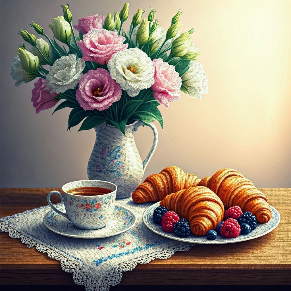This image shows a vibrant bead mosaic still life with tea, croissants, and berries. The hyperrealistic digital art features delicate details, a soft focus, and a muted color palette, reminiscent of shimmering glass beads.