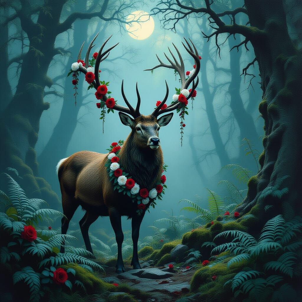 Easily generate unique images of stags entwined with roses. Try our free AI image creator now!