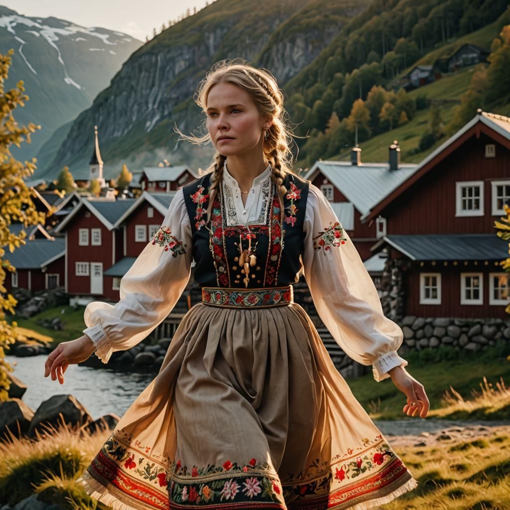 This image shows a woman in traditional Norwegian clothing dancing in a fjord village. The artwork features a warm color palette, soft focus and intricate details, reminiscent of folk art.