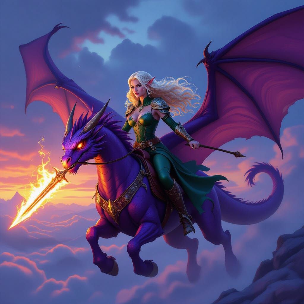 An ethereal elf on a purple dragon confronts a goblin in a misty, twilight sky. She wields a flaming sword, with vibrant oranges and purples illuminating the scene in a dramatic fantasy style.