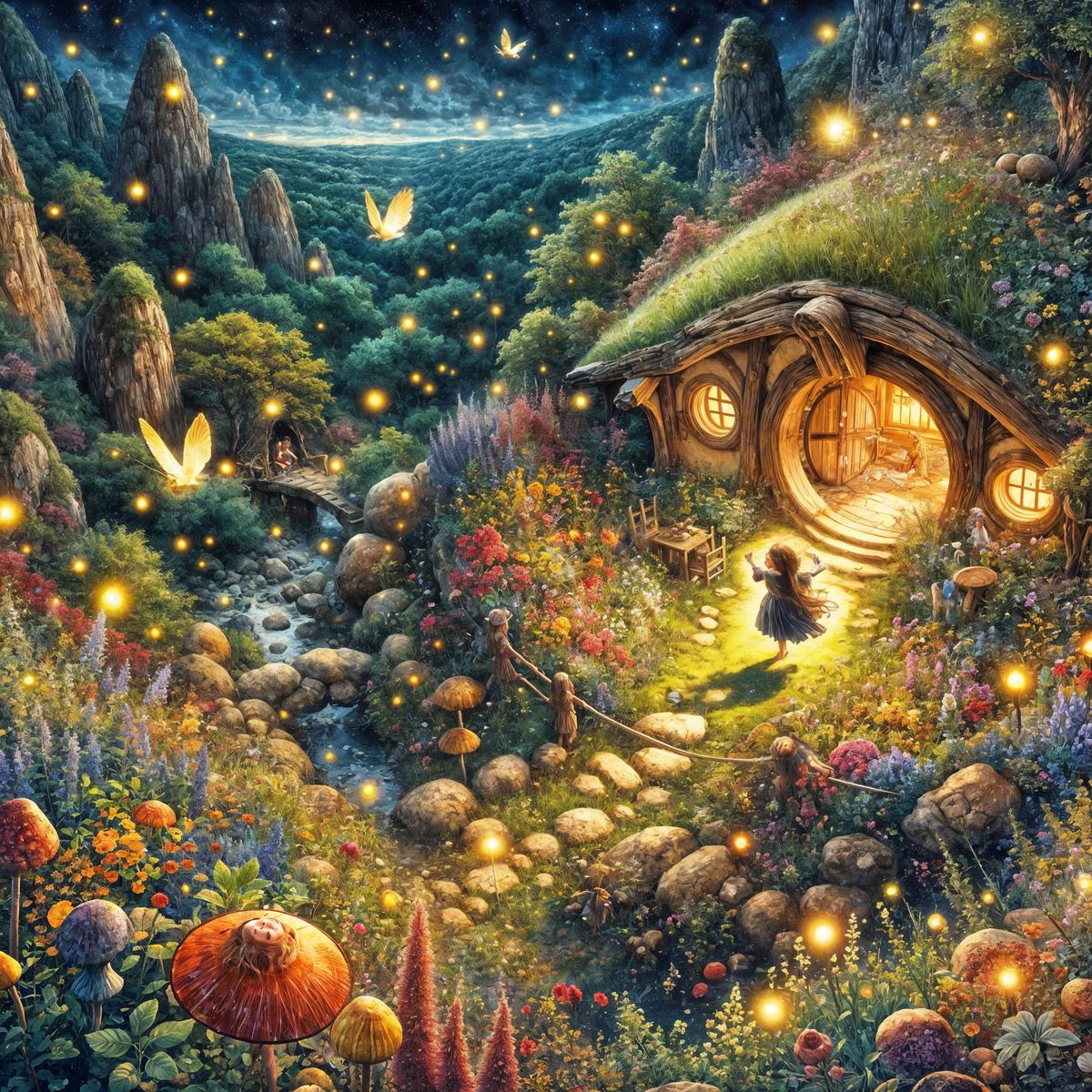 This manga-style image depicts a girl playing in a vibrant garden with fireflies, hobbit-like dwelling, and falling petals. Features detailed landscapes and a starry night sky.