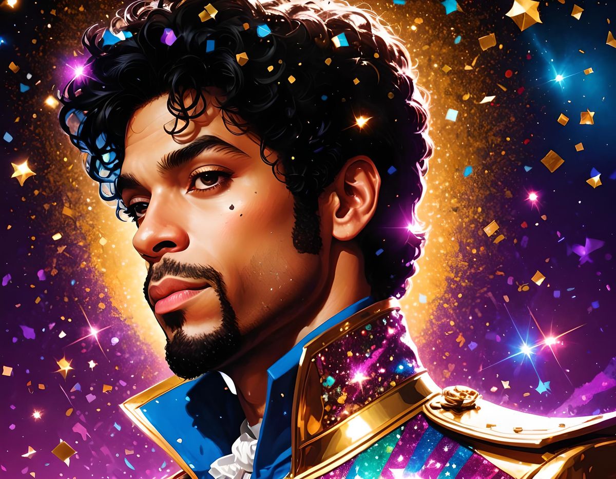 A digital illustration of Prince surrounded by glitter and sparkles. The portrait features detailed character design and background elements rendered in a high-resolution cinematic style.