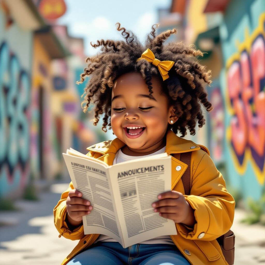 A beaming Black girl with a round face reads school announcements on an afternoon ride. The image features vibrant graffiti and street art with high contrast colors.