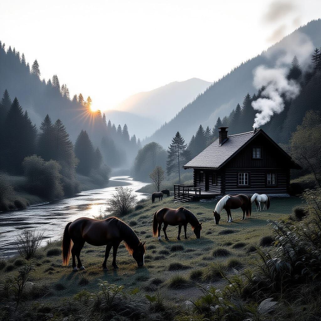A black and white landscape featuring horses grazing near a cabin with smoke rising from its chimney. A river flows through lush foliage, capturing a serene sunrise in a monochrome style.