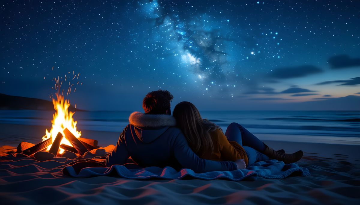 A hyperrealistic image of a couple lying on a beach at night, gazing at the stars. A bonfire roars beside them, creating a moody, atmospheric scene with intricate details and high contrast.