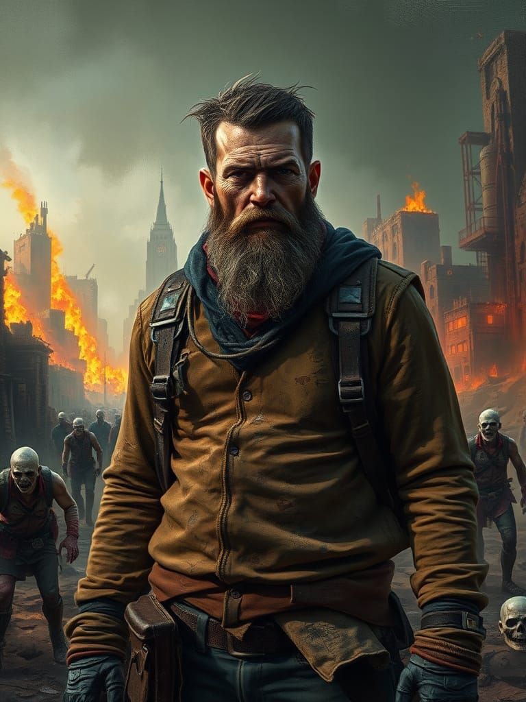 A striking picture of a lone survivor in a post-apocalyptic cityscape. Flames engulf crumbling buildings while zombies shamble in the distance. The survivor's weathered face shows determination in this gritty, dieselpunk-infused scene.