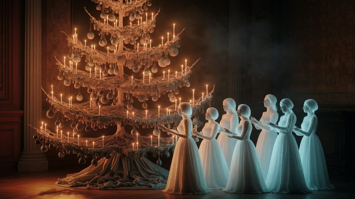 This image shows a spectral Christmas tree with tarnished ornaments and ethereal candlelight, surrounded by translucent carolers in a Victorian parlor, blending festive Christmas spirit with Halloween eeriness.