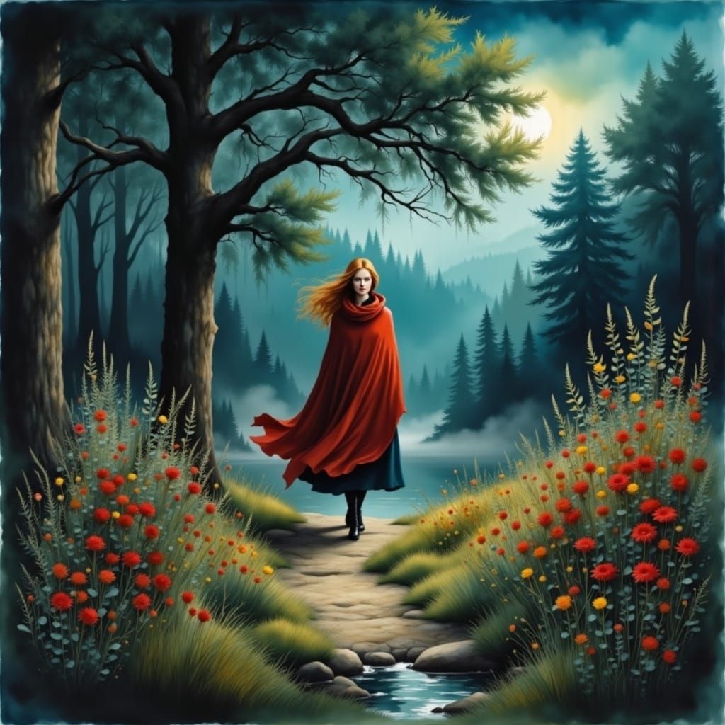 A striking picture of a red-haired woman in a red cape walking through a forest at night. This dreamy watercolor-style image features an English forest with flowers.
