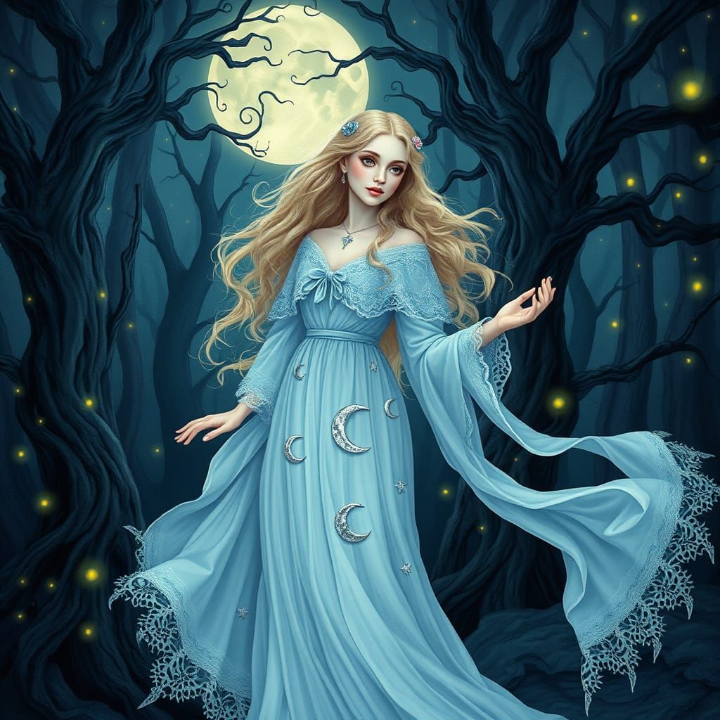 A mystical goddess is surrounded by the soft glow of fireflies and the twisted trees of a moonlit forest, her Victorian-inspired dress adorned with intricate silver embroidery and crescent moons.