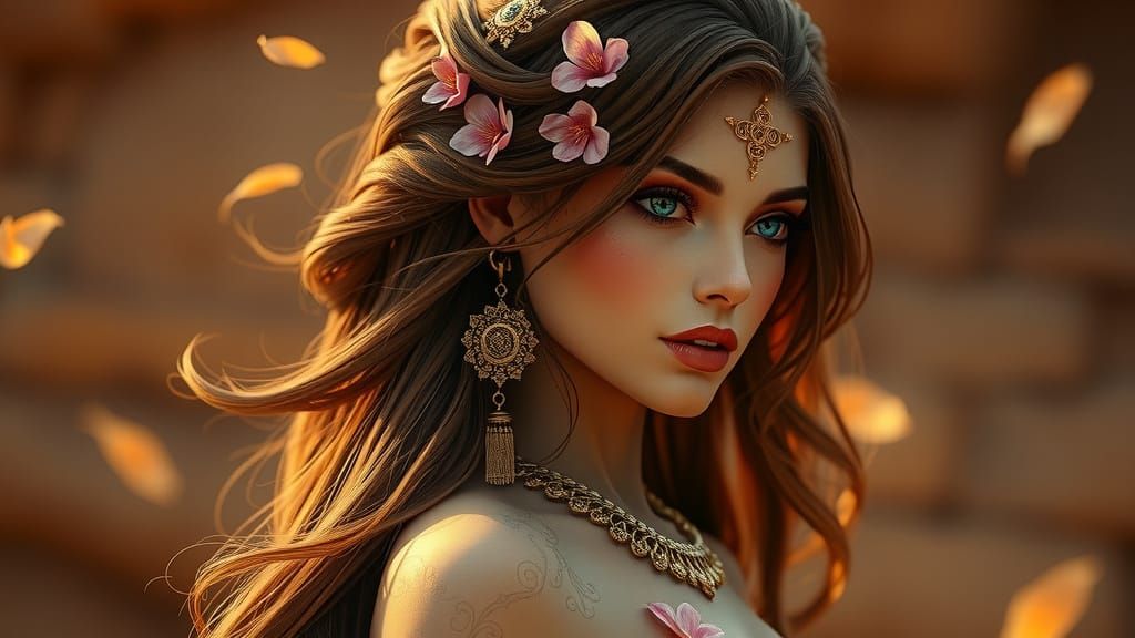 This image showcases a majestic woman with a statuesque presence, set against a warm, earthy backdrop. Her long, chestnut-brown hair cascades down her back, adorned with delicate flowers and intricate gold ornaments. Her skin features a subtle, golden undertone with natural, swirling patterns, rendered i...