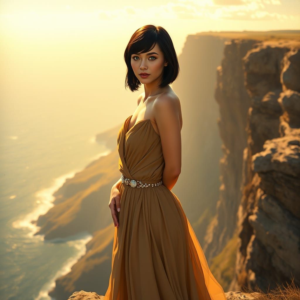 A beautiful woman with short black hair and emerald green eyes stands confidently on a windswept cliff, exuding quiet self-assurance in a flowing gown, reminiscent of Pre-Raphaelite masterpieces and romantic paintings