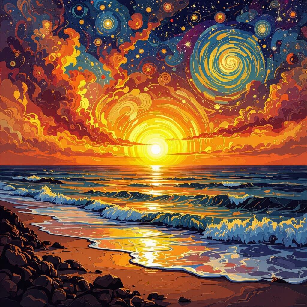 A vivid seascape at sunrise with golden light and swirling brushstrokes. The image blends mixed media with cosmic elements in a visionary art style, full of intricate textures and celestial colors.