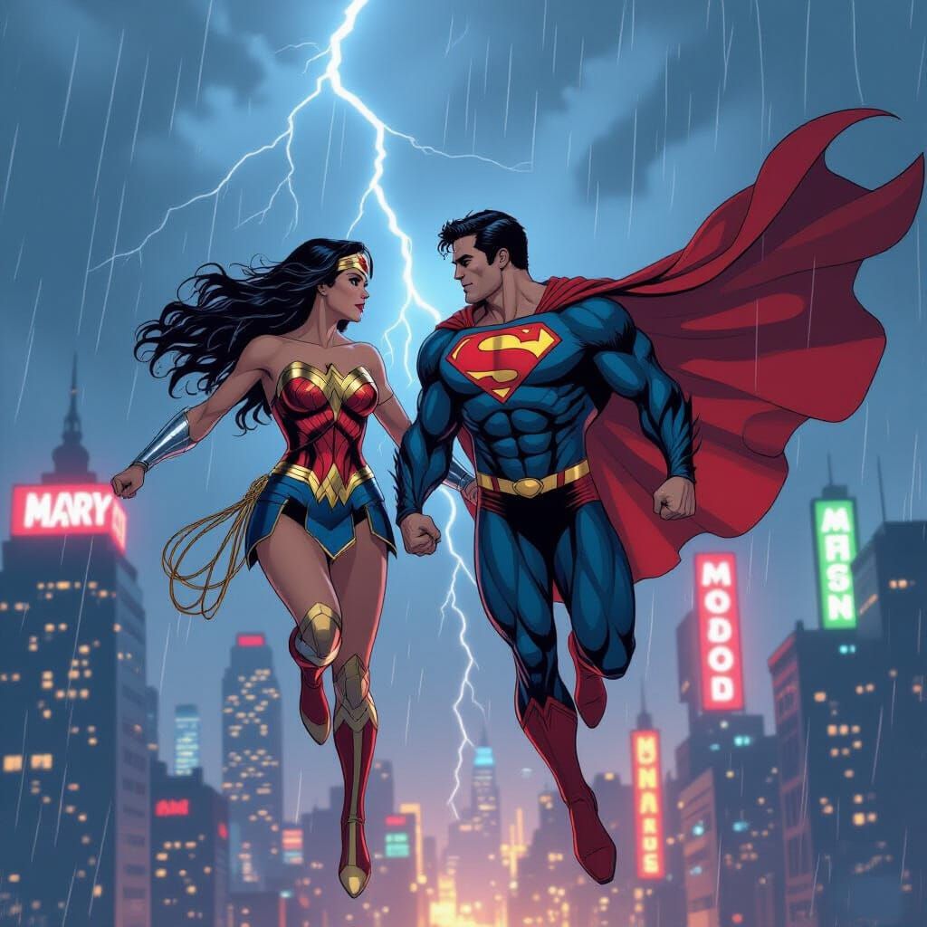 A dynamic comic book style illustration of Wonder Woman and Superman flying together through a rainy, neon-lit futuristic city at night. Lightning flashes illuminate their costumes.