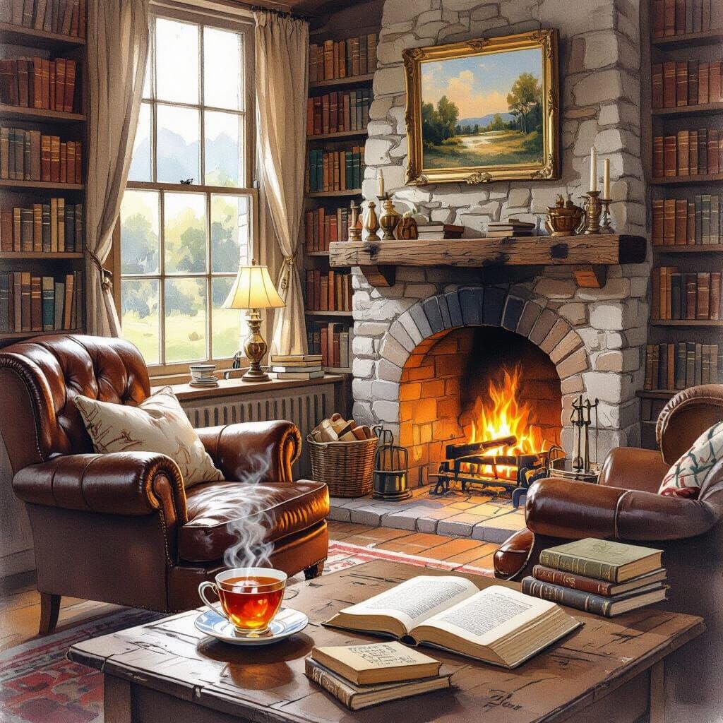 A warm and inviting cottage interior with a fireplace and bookshelves. A cup of tea sits on a table next to an armchair. This image is reminiscent of classic watercolor paintings.