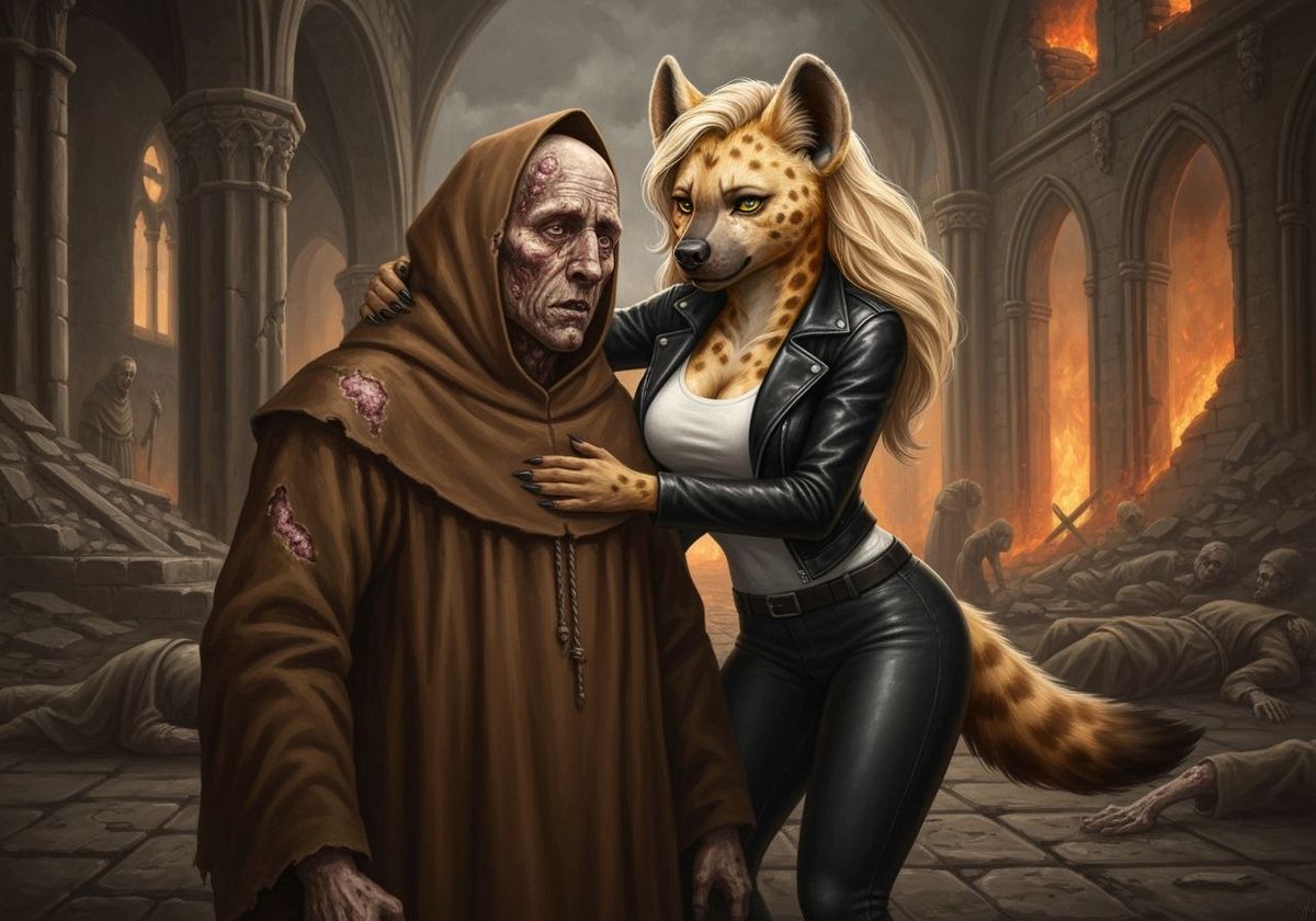 This oil painting shows a blonde anthropomorphic hyena in leather attire comforting a decrepit leper-monk amidst the smoldering ruins of a destroyed monastery. Intricate detail and dramatic lighting.