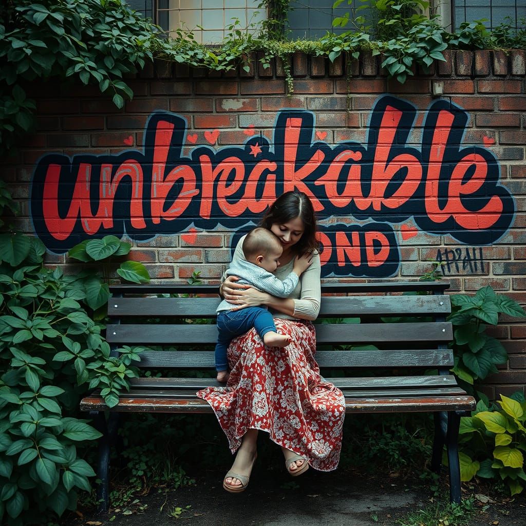 This enchanting image depicts a close-up of a mother and child amidst lush greenery and vibrant graffiti text "unbreakable bond" on a weathered brick wall. A woman is sitting on a bench after walking while holding her child in her arms. It evokes a sense of surreal wonder and ethereal landscapes, reminiscent ...